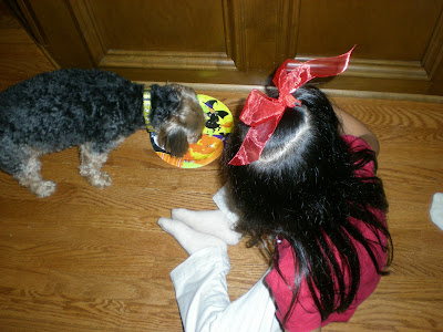 Our dogs Jack ("Noodle") and Mikey were enjoying a little bit of left over homemade pizza that we ate for dinner last night. :) We were surprised when Emma sat down next to Noodle and "helped" him eat. She was moving his plate closer to him, petting him and telling him "Good boy, you eat Jack". Her actions were soft and controlled. Jack trusted her enough to not snap or growl. For those few minutes Emma had control of herself. It was awesome. :) And, as you can see Sophie preferred to just sit and take her time eating!!!